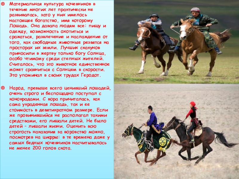 Слайд 17Наверняка, каждому известно, что кони – главная ценность всех кочевых народов.