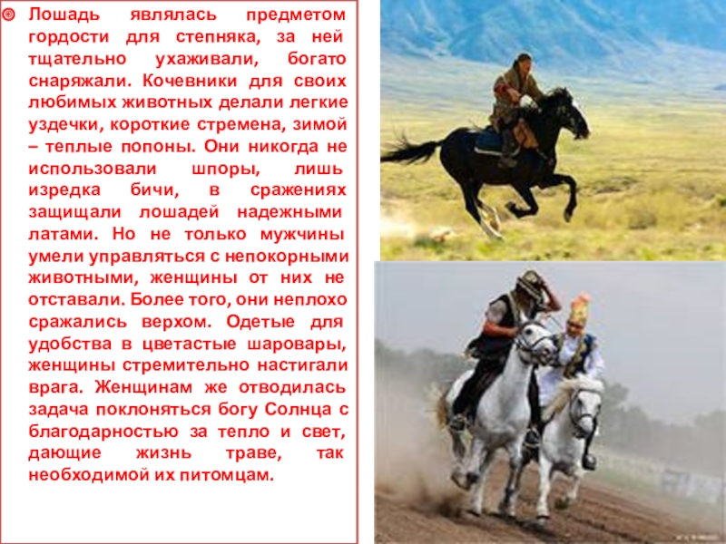 Слайд 21Лошадь являлась предметом гордости для степняка, за ней тщательно ухаживали, богато