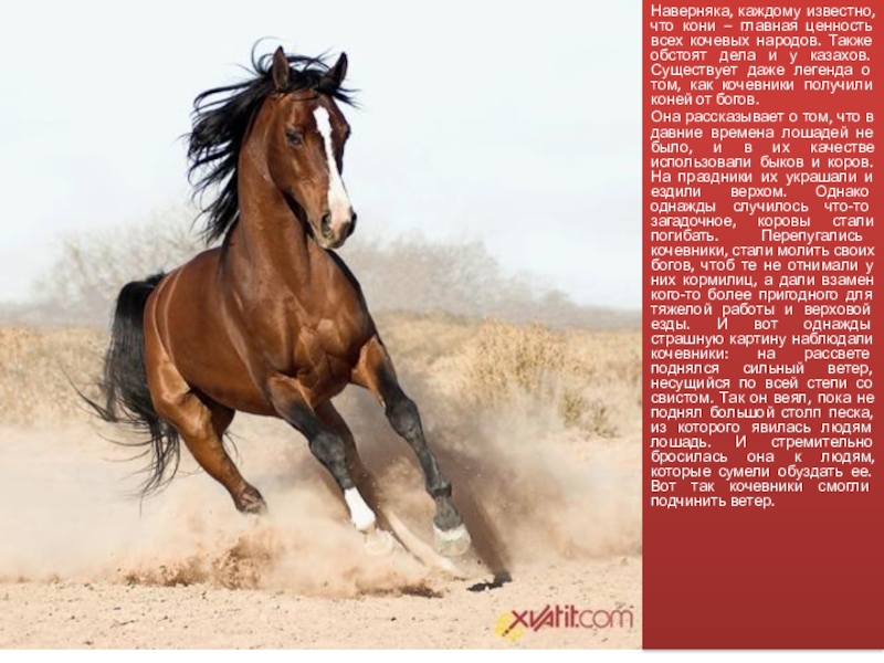 Также обстоят дела и у казахов. Существует даже легенда о том, как кочевники получили коней от богов.