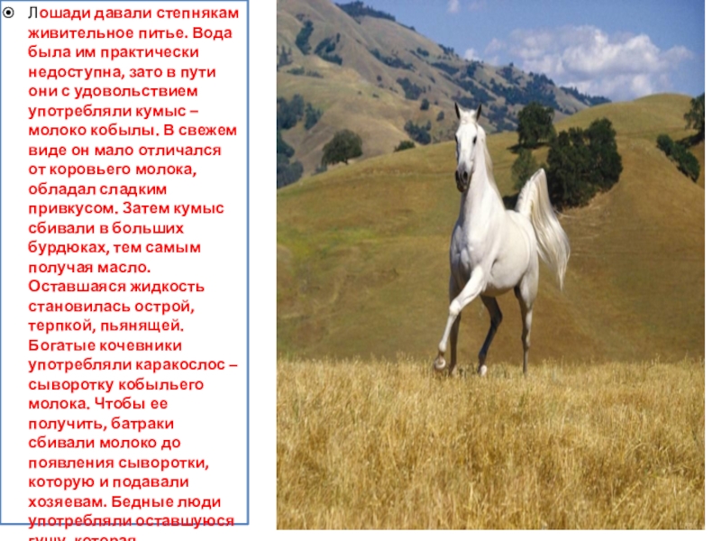 Слайд 19Лошади давали степнякам живительное питье. Вода была им практически недоступна, зато
