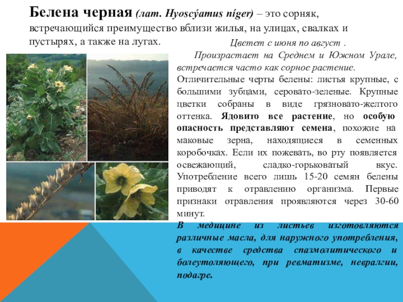 Слайд 6Белена черная (лат. Hyoscýamus níger) – это сорняк, встречающийся преимущество вблизи жилья, на