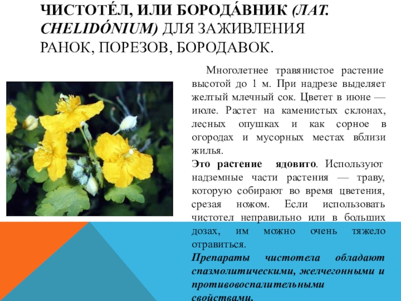 Слайд 8ЧИСТОТЕ́Л, ИЛИ БОРОДА́ВНИК (ЛАТ. CHELIDÓNIUM) ДЛЯ ЗАЖИВЛЕНИЯ РАНОК, ПОРЕЗОВ, БОРОДАВОК.
