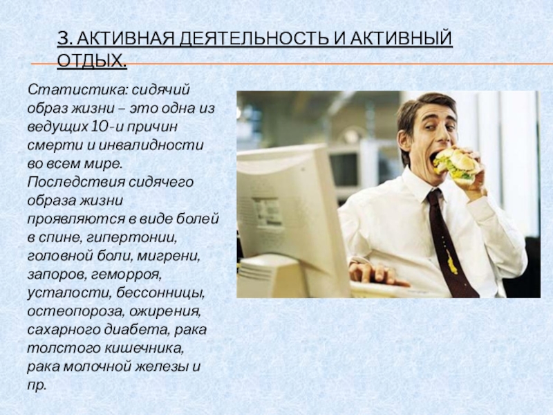 одна из ведущих 10-и причин смерти и инвалидности во всем мире. Последствия сидячего образа жизни проявляются в виде болей в спине, гипертонии, головной боли, мигрени, запоров, геморроя, усталости, бессонницы, остеопороза, ожирения, сахарного диабета, рака толстого кишечника, рака молочной железы и пр.