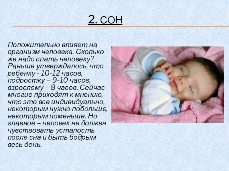человеку? Раньше утверждалось, что ребенку - 10-12 часов, подростку – 9-10 часов, взрослому – 8 часов. Сейчас многие приходят к мнению, что это все индивидуально, некоторым нужно побольше, некоторым поменьше. Но главное – человек не должен чувствовать усталость после сна и быть бодрым весь день.
