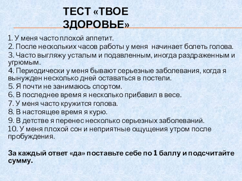 За каждый ответ «да» поставьте себе по 1 баллу и подсчитайте сумму.