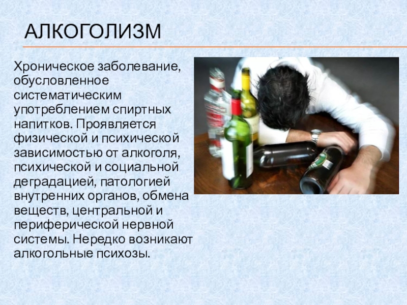 зависимостью от алкоголя, психической и социальной деградацией, патологией внутренних органов, обмена веществ, центральной и периферической нервной системы. Нередко возникают алкогольные психозы.