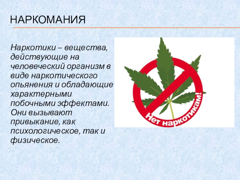 Наркотики – вещества, действующие на человеческий организм в виде наркотического опьянения