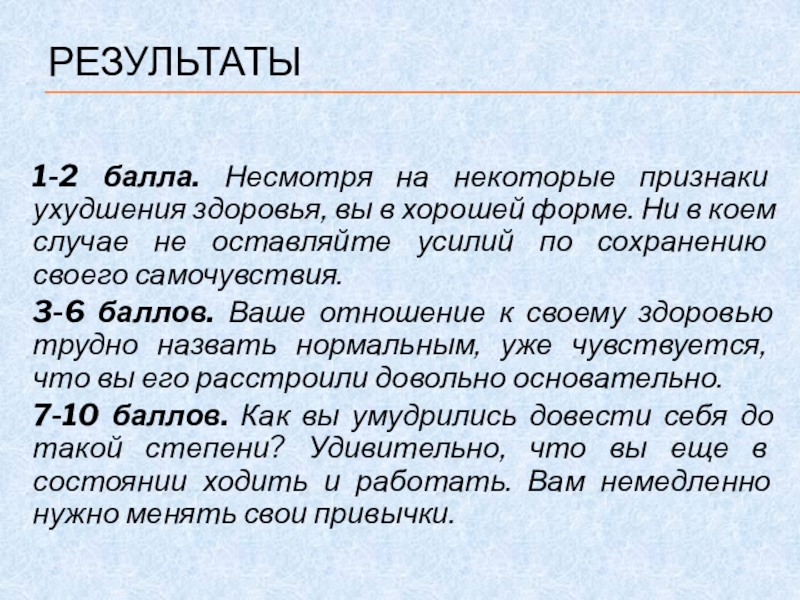 3-6 баллов. Ваше отношение к своему здоровью трудно назвать нормальным, уже чувствуется, что вы его расстроили довольно основательно.