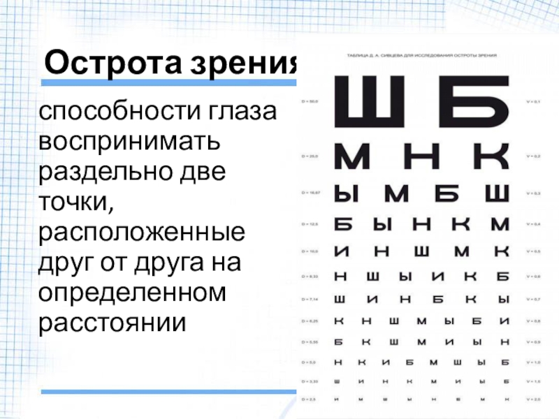 Острота зренияспособности глаза воспринимать раздельно две точки, расположенные друг от друга на определенном расстоянии