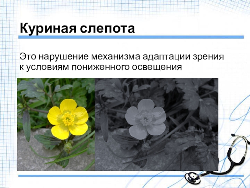 Куриная слепота Это нарушение механизма адаптации зрения к условиям пониженного освещения