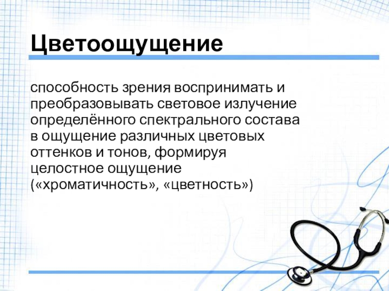 Цветоощущение способность зрения воспринимать и преобразовывать световое излучение определённого спектрального состава в ощущение различных цветовых оттенков и тонов, формируя целостное ощущение («хроматичность», «цветность»)