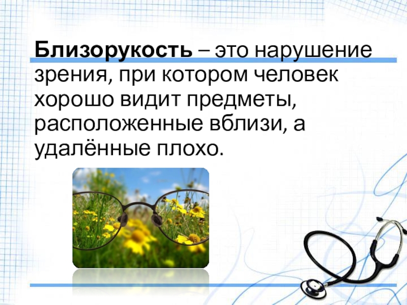 Близорукость – это нарушение зрения, при котором человек хорошо видит предметы, расположенные вблизи, а удалённые плохо.