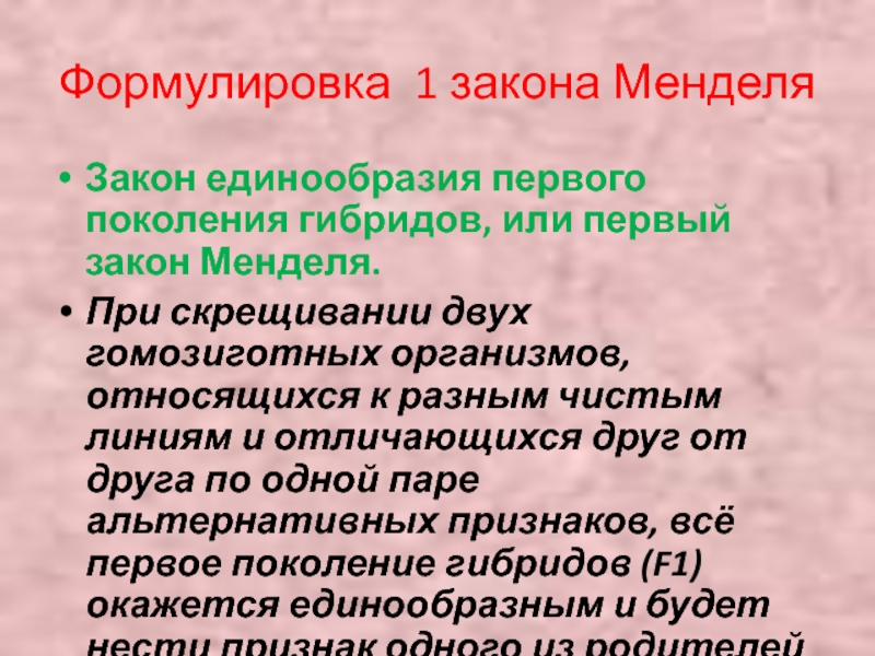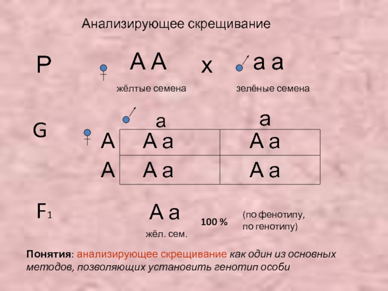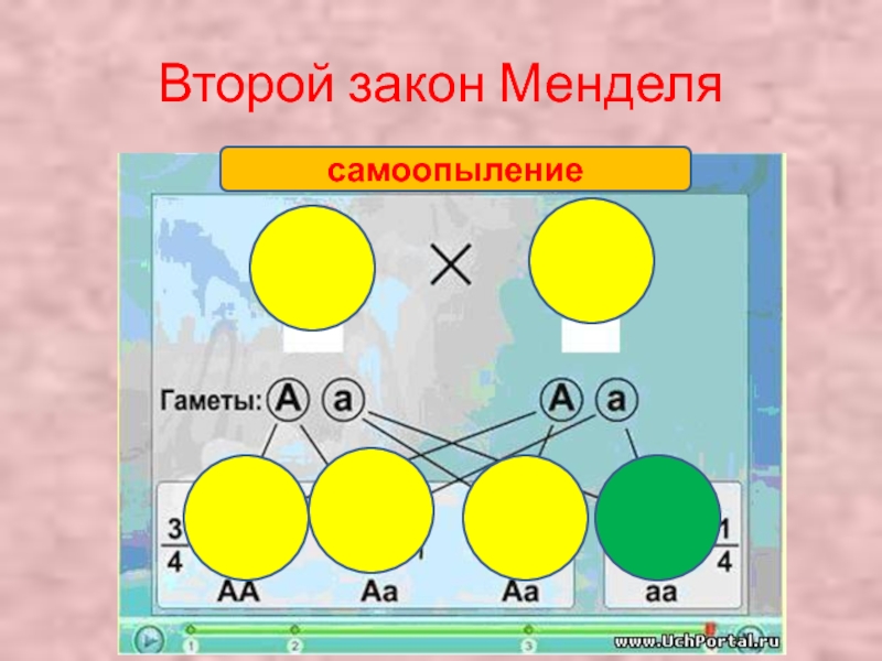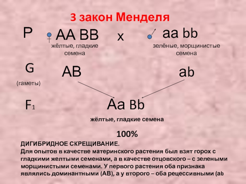 Для опытов в качестве материнского растения был взят горох с гладкими желтыми семенами, а в качестве отцовского – с зелеными морщинистыми семенами. У первого растения оба признака являлись доминантными (АВ), а у второго – оба рецессивными (аb