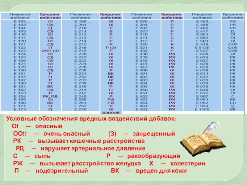 Условные обозначения вредных воздействий добавок: