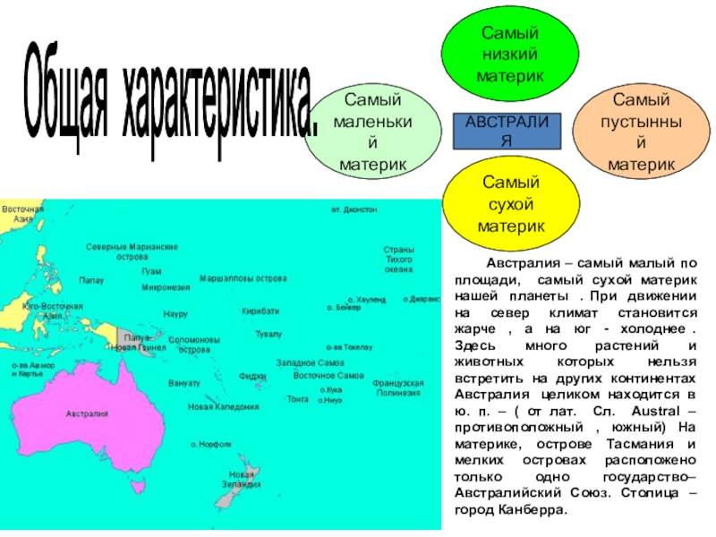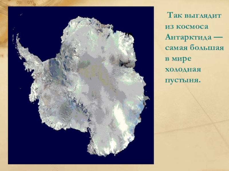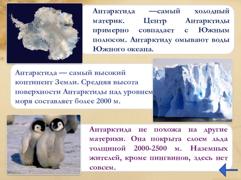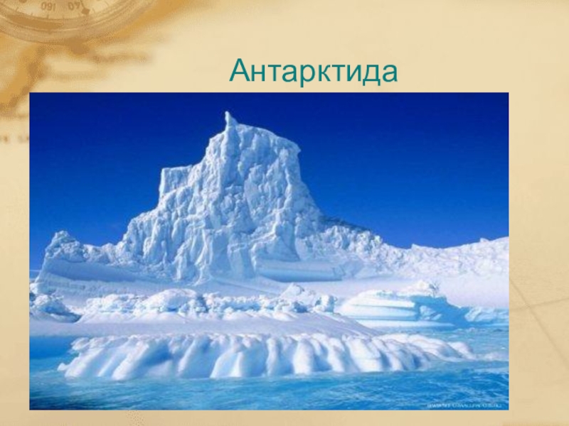 Антарктида —самый холодный материк. Центр Антарктиды примерно совпадает с Южным полюсом. Антарктиду омывают воды Южного океана.