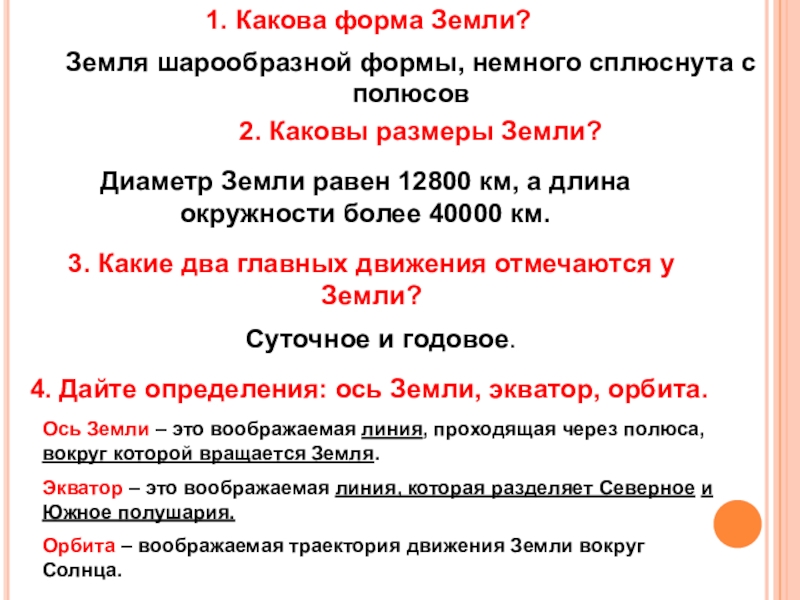 4. Дайте определения: ось Земли, экватор, орбита.