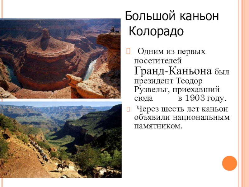 Особую известность получил Большой каньон реки Колорадо. Глубина каньона достигает 1800 метров.