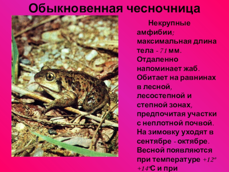 тела - 71 мм. Отдаленно напоминает жаб. Обитает на равнинах в лесной, лесостепной и степной зонах, предпочитая участки с неплотной почвой. На зимовку уходят в сентябре - октябре. Весной появляются при температуре +12º +14ºС и при температуре воды +9º +15ºС. Продолжительность жизни в природе - не более 4 лет.