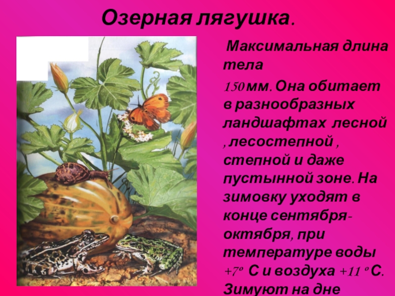 150 мм. Она обитает в разнообразных ландшафтах лесной , лесостепной , степной и даже пустынной зоне. На зимовку уходят в конце сентября-октября, при температуре воды +7º С и воздуха +11 º С. Зимуют на дне глубоких непромерзающих водоёмов.