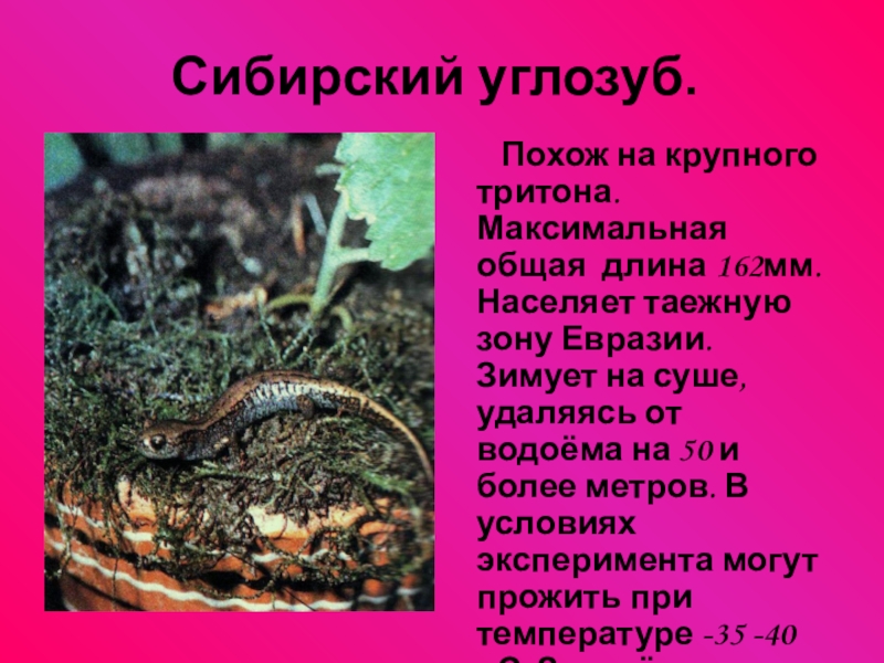 общая длина 162мм. Населяет таежную зону Евразии. Зимует на суше, удаляясь от водоёма на 50 и более метров. В условиях эксперимента могут прожить при температуре -35 -40оС. Занесён в Красную книгу Нижегородской области.