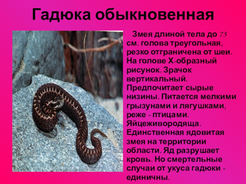 см. голова треугольная, резко отграничена от шеи. На голове Х-образный рисунок. Зрачок вертикальный. Предпочитает сырые низины. Питается мелкими грызунами и лягушками, реже - птицами. Яйцеживородяща. Единственная ядовитая змея на территории области. Яд разрушает кровь. Но смертельные случаи от укуса гадюки - единичны.