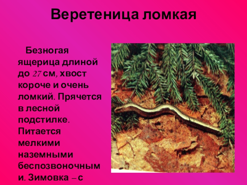 хвост короче и очень ломкий. Прячется в лесной подстилке. Питается мелкими наземными беспозвоночными. Зимовка – с октября по апрель. Яйцеживородяща.