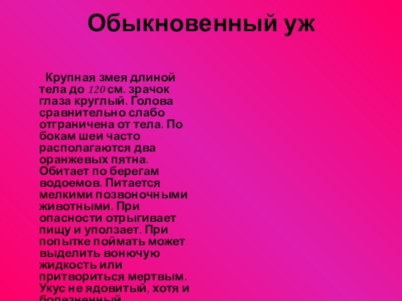 до 120 см. зрачок глаза круглый. Голова сравнительно слабо отграничена от тела. По бокам шеи часто располагаются два оранжевых пятна. Обитает по берегам водоемов. Питается мелкими позвоночными животными. При опасности отрыгивает пищу и уползает. При попытке поймать может выделить вонючую жидкость или притвориться мертвым. Укус не ядовитый, хотя и болезненный.