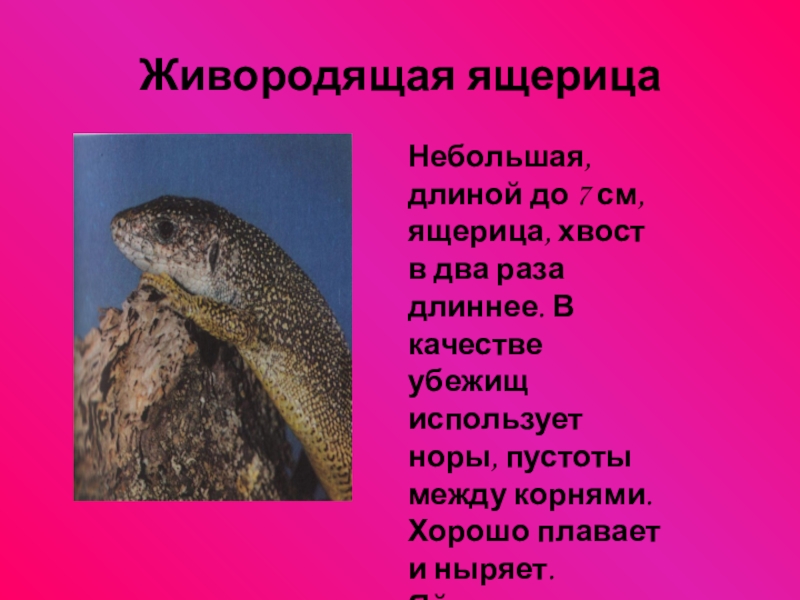 длиннее. В качестве убежищ использует норы, пустоты между корнями. Хорошо плавает и ныряет. Яйцеживородяща.