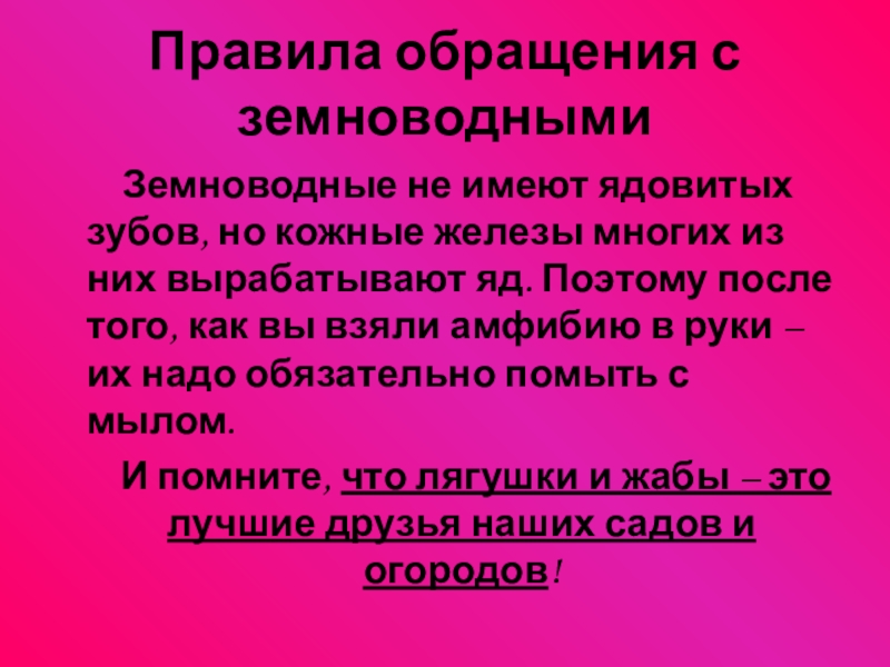зубов, но кожные железы многих из них вырабатывают яд. Поэтому после того, как вы взяли амфибию в руки – их надо обязательно помыть с мылом.