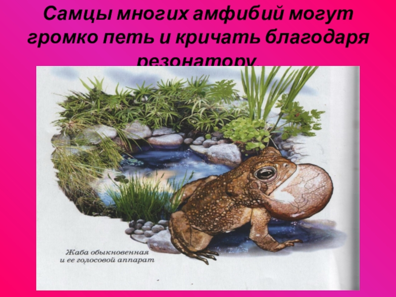 Слайд 6Самцы многих амфибий могут громко петь и кричать благодаря резонатору.