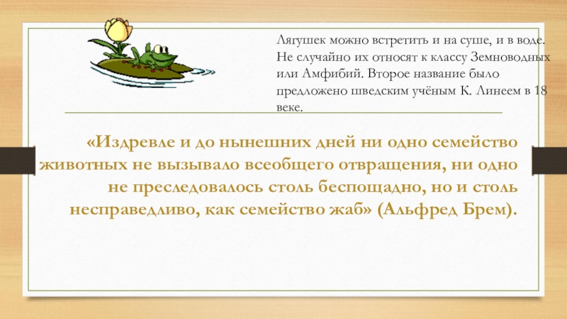 всеобщего отвращения, ни одно не преследовалось столь беспощадно, но и столь несправедливо, как семейство жаб» (Альфред Брем).