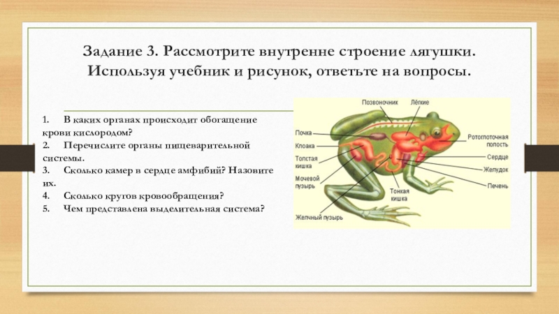 Слайд 12Задание 3. Рассмотрите внутренне строение лягушки. Используя учебник и рисунок, ответьте