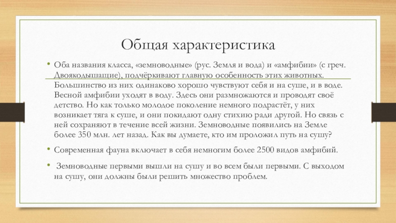 «амфибии» (с греч. Двоякодышащие), подчёркивают главную особенность этих животных. Большинство из них одинаково хорошо чувствуют себя и на суше, и в воде. Весной амфибии уходят в воду. Здесь они размножаются и проводят своё детство. Но как только молодое поколение немного подрастёт, у них возникает тяга к суше, и они покидают одну стихию ради другой. Но связь с ней сохраняют в течение всей жизни. Земноводные появились на Земле более 350 млн. лет назад. Как вы думаете, кто им проложил путь на сушу?