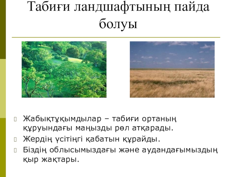 Табиғи ландшафтының пайда болуыЖабықтұқымдылар – табиғи ортаның құруындағы маңызды рөл атқарады.Жердің үсітіңгі қабатын құрайды.Біздің облысымыздағы және аудандағымыздың