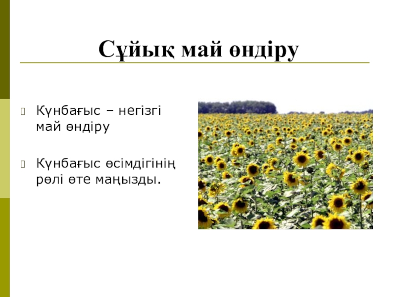 Сұйық май өндіруКүнбағыс – негізгі май өндіруКүнбағыс өсімдігінің рөлі өте маңызды.