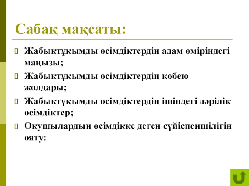 Сабақ мақсаты:Жабықтұқымды өсімдіктердің адам өміріндегі маңызы;Жабықтұқымды өсімдіктердің көбею жолдары;Жабықтұқымды өсімдіктердің ішіндегі дәрілік өсімдіктер;Оқушылардың өсімдікке деген сүйіспеншілігін ояту: