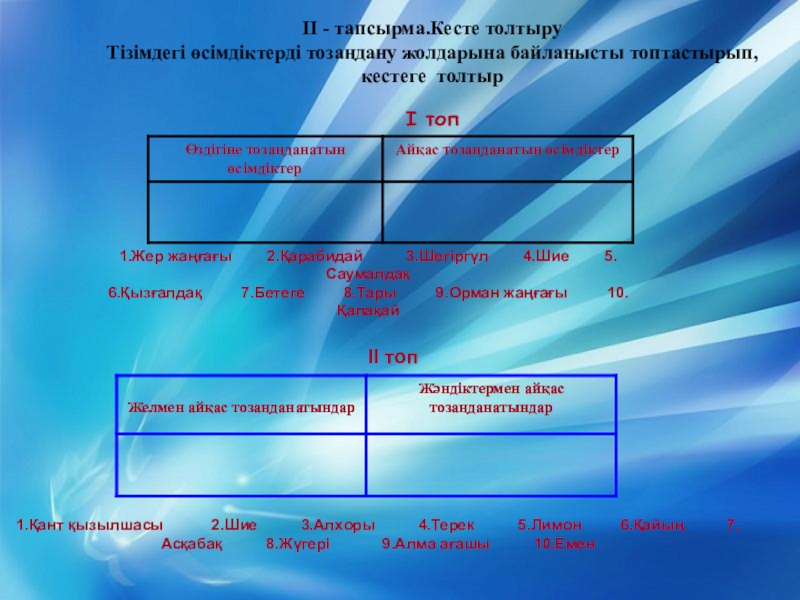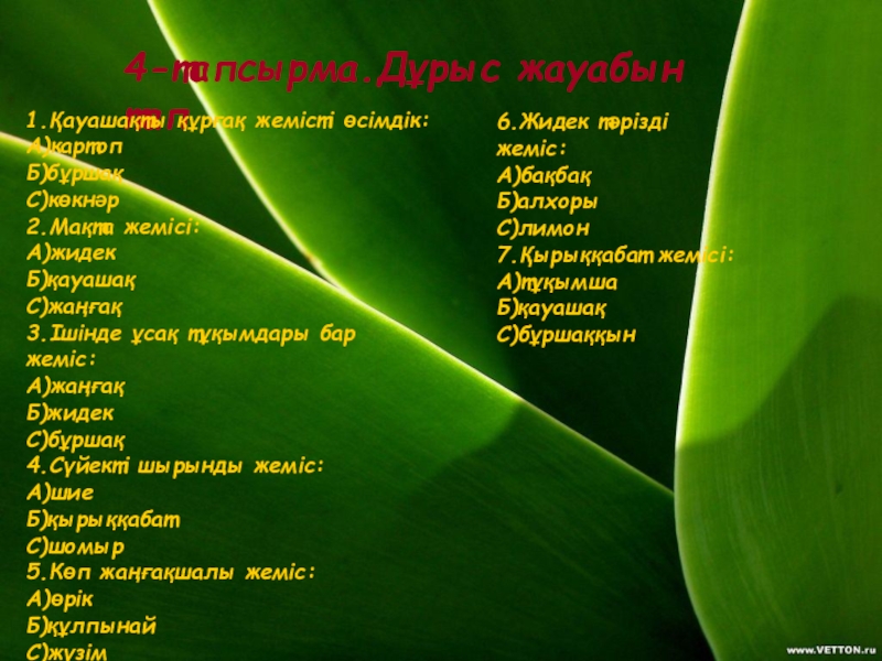 1.Қант қызылшасы 2.Шие 3.Алхоры 4.Терек 5.Лимон 6.Қайың 7.Асқабақ 8.Жүгері 9.Алма ағашы 10.Емен