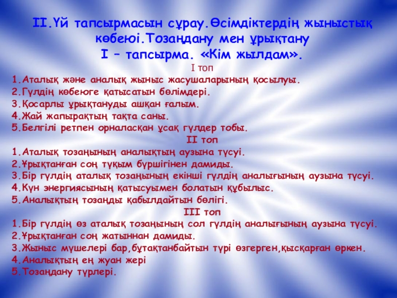 6.Қызғалдақ 7.Бетеге 8.Тары 9.Орман жаңғағы 10.Қалақай