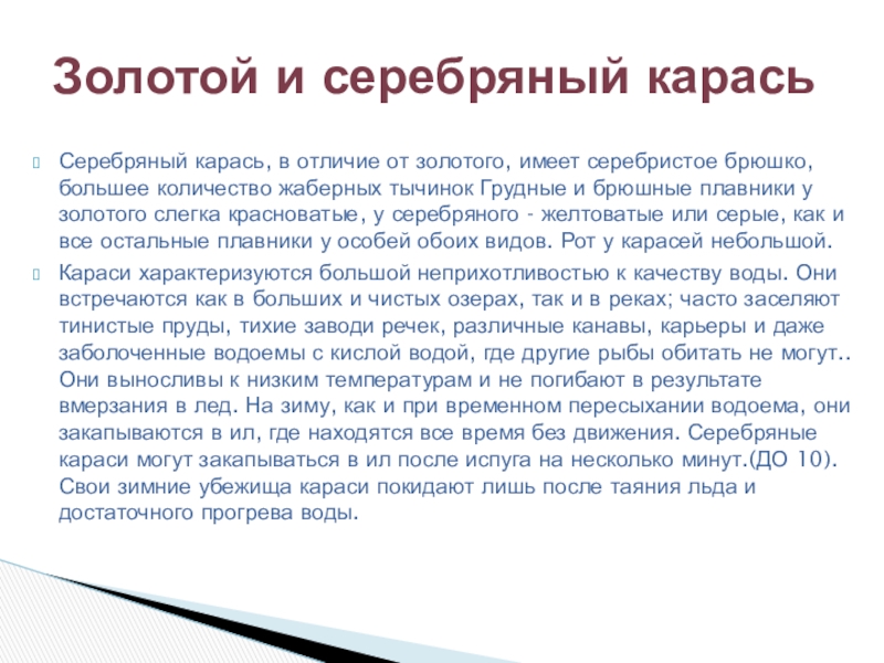 жаберных тычинок Грудные и брюшные плавники у золотого слегка красноватые, у серебряного - желтоватые или серые, как и все остальные плавники у особей обоих видов. Рот у карасей небольшой.