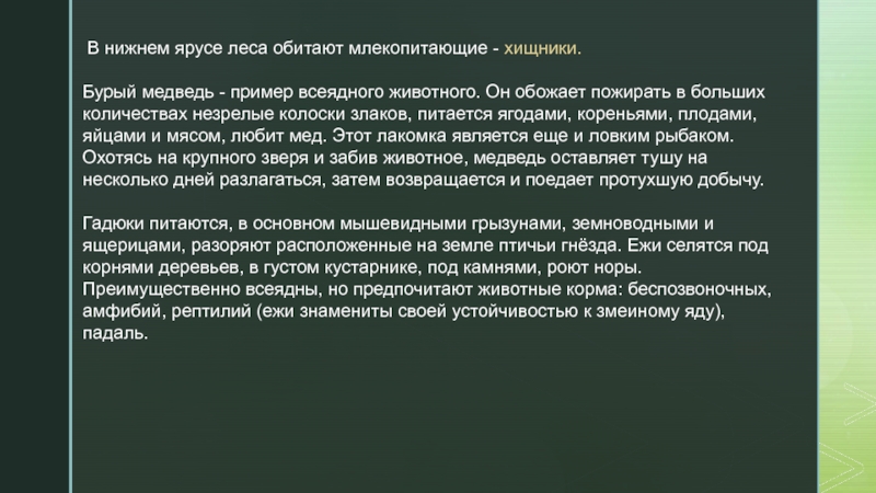 Слайд 14 В нижнем ярусе леса обитают млекопитающие - хищники.