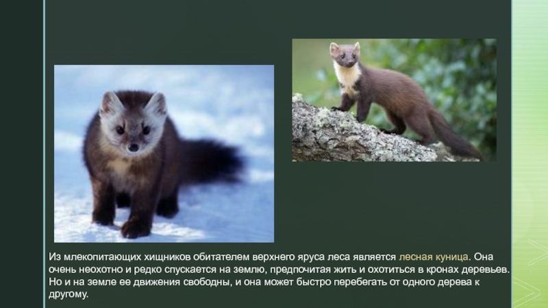 Слайд 6Из млекопитающих хищников обитателем верхнего яруса леса является лесная куница. Она