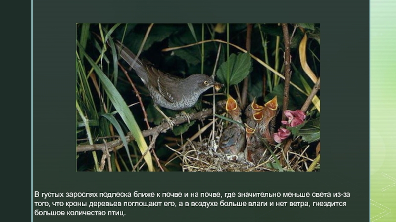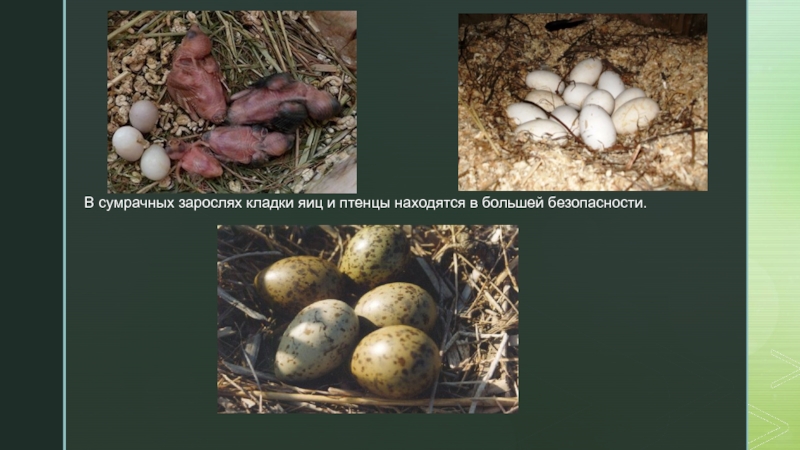 Слайд 12В сумрачных зарослях кладки яиц и птенцы находятся в большей безопасности.