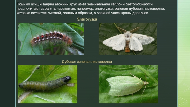 предпочитают заселять насекомые, например, златогузка, зеленая дубовая листовертка, которые питаются листвой, главным образом, в верхней части кроны деревьев.