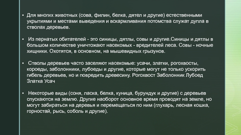 Слайд 10Для многих животных (сова, филин, белка, дятел и другие) естественными укрытиями