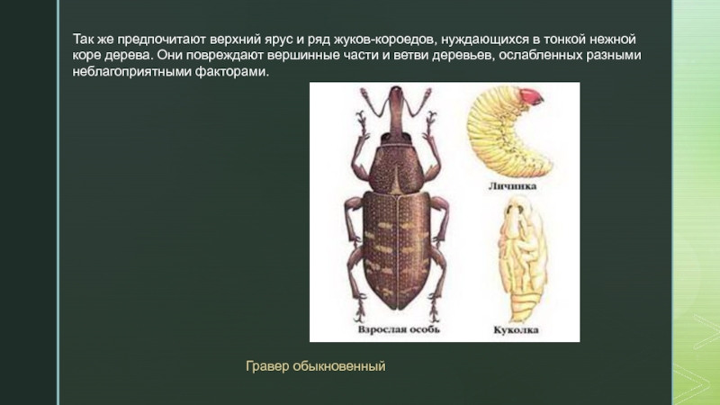Слайд 8Так же предпочитают верхний ярус и ряд жуков-короедов, нуждающихся в тонкой