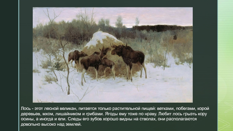 Слайд 13Лось - этот лесной великан, питается только растительной пищей: ветками, побегами,