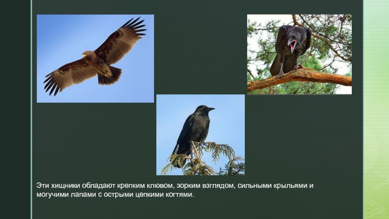 Слайд 5Эти хищники обладают крепким клювом, зорким взглядом, сильными крыльями и могучими