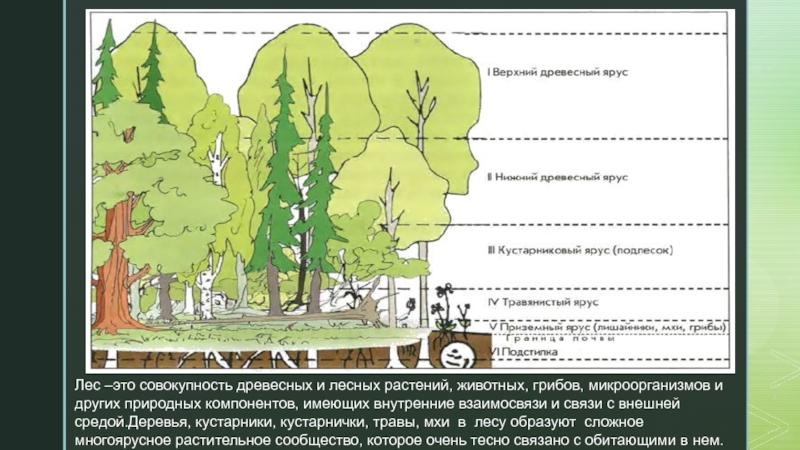 других природных компонентов, имеющих внутренние взаимосвязи и связи с внешней средой.Деревья, кустарники, кустарнички, травы, мхи в лесу образуют сложное многоярусное растительное сообщество, которое очень тесно связано с обитающими в нем. животными.