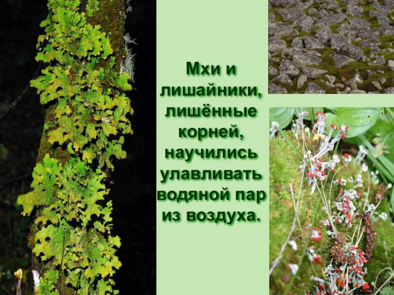 Слайд 11Мхи и лишайники, лишённые корней, научились улавливать водяной пар из воздуха.
