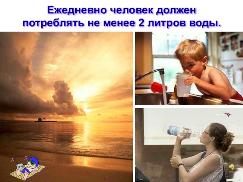 Слайд 16Ежедневно человек должен потреблять не менее 2 литров воды.